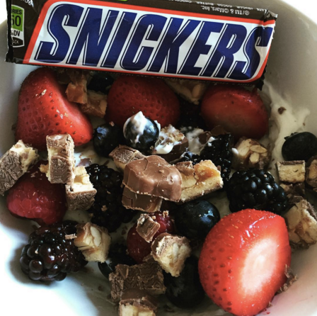 One of my staple meals during this prep: Greek yogurt, mixed berries, and a chopped up Snickers bar.