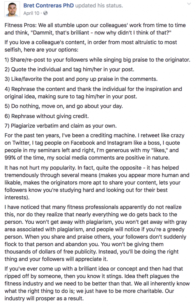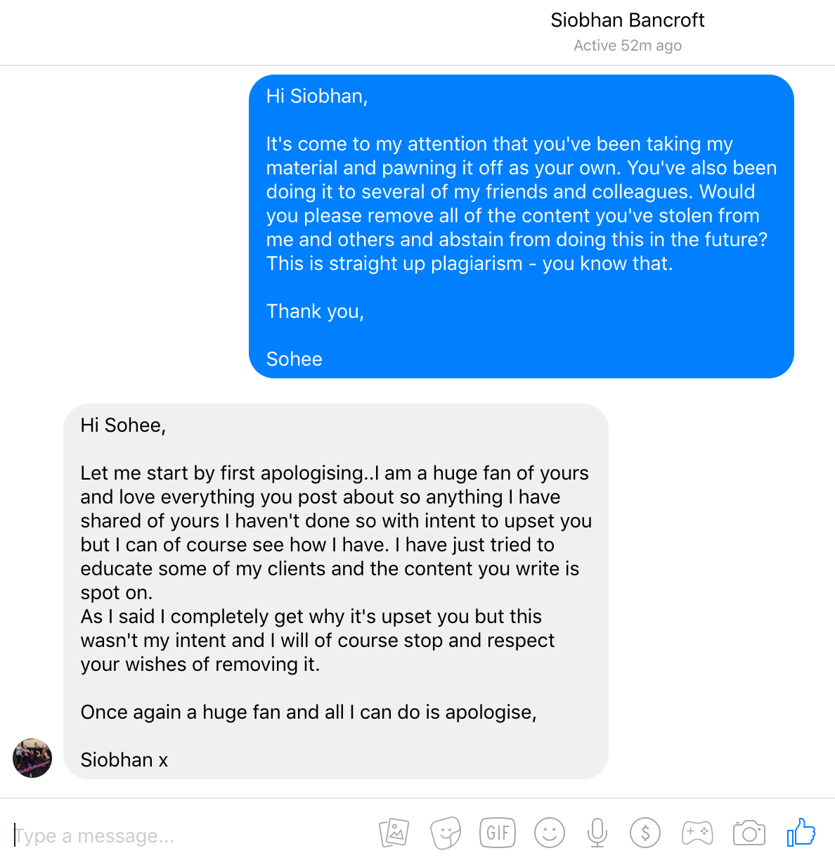 I was inspired to write this post after sitting quietly and watching as my work and those of my colleagues have been ripped off left and right over the past several years. The straw that broke the camel’s back, in this case, was a personal trainer based in the UK named Siobhan Bancroft, who added me as a Facebook friend a while ago.