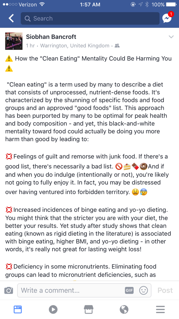 On June 29, I was scrolling through my Facebook newsfeed when a post of hers popped up. The topic was how the clean eating mentality could be harming individuals. Interesting! That was right up my alley, so I kept reading. A few lines in, I found myself raising my eyebrows because I quickly realized that actually, those were my exact words.
