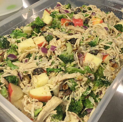2. Mix together broccoli, raisins, walnut pieces, and red onions with chicken.