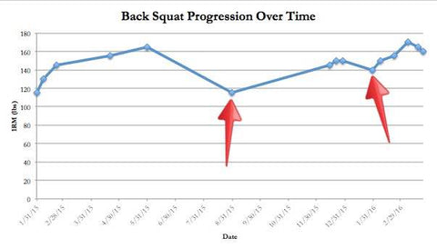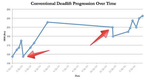 Looking at nothing but absolute training numbers doesn’t tell the whole story, as you can see. With regards to my back squat, we can attribute the fluctuations in 1RM to actual strength loss (first arrow) and intentionally scaling back weight to improve form (second arrow).