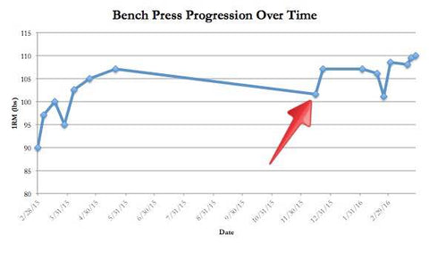 The drop in strength from May to November of last year (see arrow) is simply due to lack of training specificity. During the summer months, I stuck primarily with incline bench press and close-grip bench press in the higher rep ranges (6-15). The good news, though, is that when I circled back to low rep pause bench press, I hadn’t lost all of my strength, and my 1RM was still a good bit above where I was when I first started. So while the graph may seem to indicate strength loss, this is actually a net win.