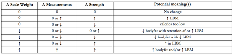 Here is an admittedly rudimentary table I’ve put together that can serve as a starting point to help you make sense of what the scale weight might mean. For the sake of simplicity, this table is based on a number of assumptions: solid dietary adherence, sound management of sleep and stress levels, consistent sodium intake, and sound training program based upon the principles of progressive overload. In other words, I’ve controlled for as many variables as possible. Please keep in mind that there will of course be exceptions to just about every rule.